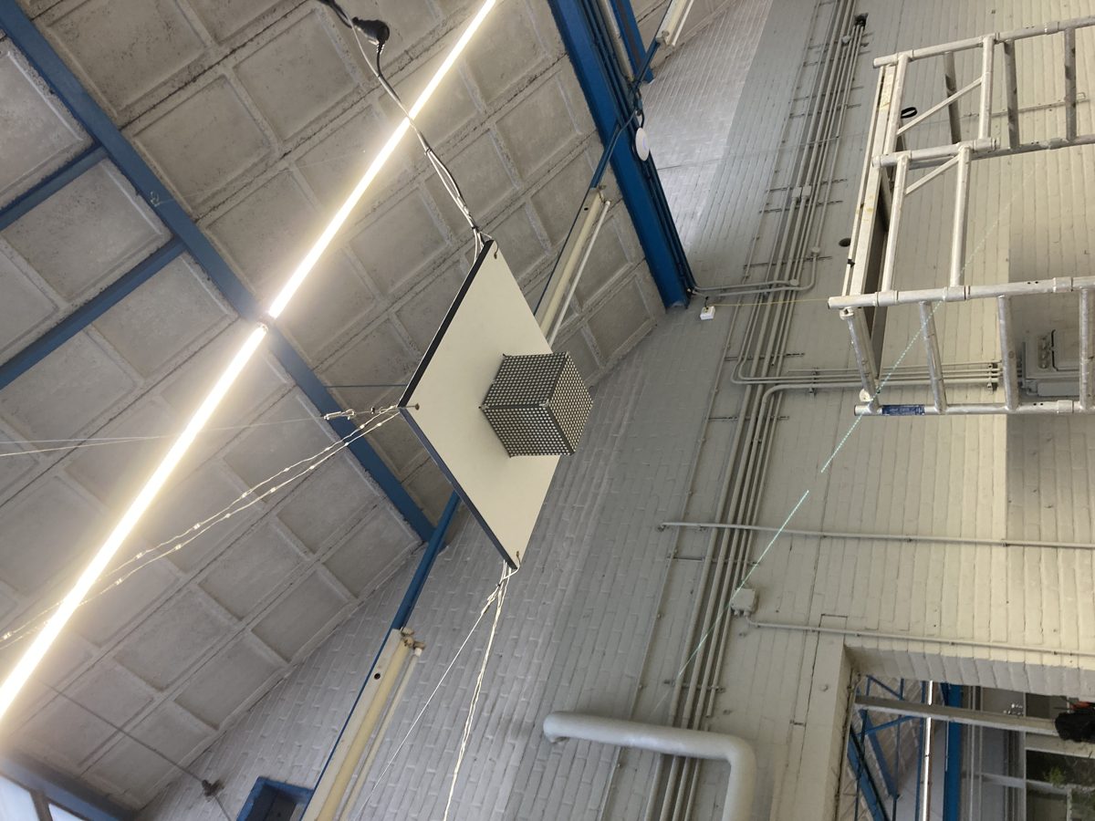 A large LED cube mounted to a white backing board and suspended above a crowd using aircraft cable. The board reflects light to amplify the effect and provides mounting space.